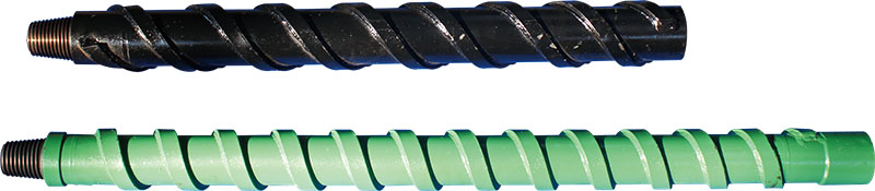 肋骨鉆桿是在鉆車用外平光鉆桿的基礎(chǔ)上,采用高耐磨平面螺旋葉片,經(jīng)預(yù)應(yīng)力纏繞焊接而成。鉆桿桿體采用寶鋼優(yōu)質(zhì)地址鉆探專用合金桿,鉆桿接頭、接管均采用優(yōu)質(zhì)合金結(jié)構(gòu)鋼,經(jīng)鍛壓成形、調(diào)質(zhì)處理、摩擦焊接等先進(jìn)生產(chǎn)工藝加工而成;由于肋骨鉆桿鉆進(jìn)、排渣速度快、旋轉(zhuǎn)阻力小的特點使其在松軟煤層、高瓦斯煤層、高沖擊地壓條件下大大降低了鉆桿抱死、鉆具損壞現(xiàn)象。由于肋骨鉆桿較寬的螺旋葉片,使得肋骨鉆桿在鉆孔施工中不會切削鉆孔的孔壁,使鉆孔定位、鉆孔效果更加精準(zhǔn)、高效。