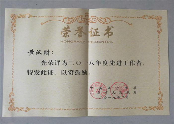 2019年2月11日,江陰市市委市政府召開(kāi)“2018年度全市先進(jìn)表彰大會(huì)”,隆重表彰過(guò)去一年涌現(xiàn)出的各行各業(yè)先進(jìn)集體和先進(jìn)個(gè)人,動(dòng)員全市上下鼓足信仰、信念、信心的風(fēng)帆。無(wú)錫市委常委、江陰市委書記陳金虎在會(huì)上作了題為《奔跑新時(shí)代 勇做追夢(mèng)人》的講話。會(huì)上,全市72個(gè)經(jīng)濟(jì)社會(huì)發(fā)展考核先進(jìn)單位、292個(gè)先進(jìn)集體和698名先進(jìn)個(gè)人受到了表彰。我公司董事長(zhǎng)黃漢財(cái)同志被中共江陰市委、江陰市人民政府評(píng)為“2018年度先進(jìn)工作者”,并被授予獎(jiǎng)牌和榮譽(yù)證書。